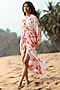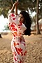 Featuring a pink and orange draped dress in bemberg satin base with kimono sleeves, tie-dye, and a slit.