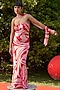 Featuring a red and pink dress in armani satin base with print, sweetheart neckline and concealed zip. It is paired with a tabby silk printed scarf. Accessorise with statement earrings and heels for a beach or casual wear.